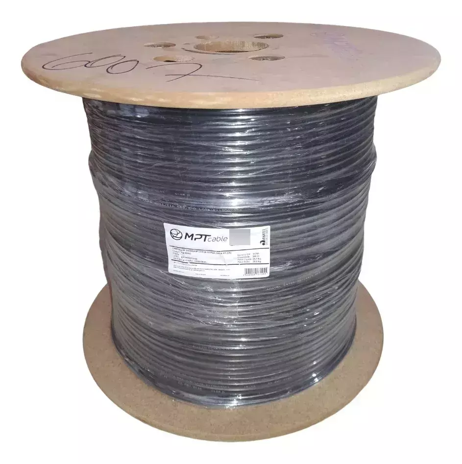 O Cabo LAN CAT 5e F/UTP 4P x 24AWG – Dupla Capa da MPT Cable é ideal para instalações internas e externas de redes de dados, oferecendo alta performance e confiabilidade. Com condutores de cobre maciço 24AWG, isolados individualmente por material termoplástico com cores distintas para identificação, torcidos em pares com passos de binagem calculados para melhorar a transmissão. Possui blindagem aluminizada com condutor dreno que protege contra interferências eletromagnéticas. O revestimento interno é de material não propagante a chama tipo CM e o revestimento externo é resistente a UV e intempéries, adequado para uso externo. Suporta aplicações como Fast Ethernet (100BASE-TX), Gigabit Ethernet (1000BASE-T), ATM-155 (UTP), 10BASE-T e Token Ring, atendendo às normas RoHS.