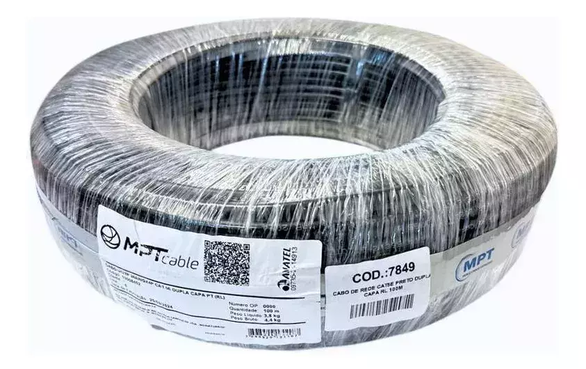 O Cabo LAN CAT 5e F/UTP 4P x 24AWG – Dupla Capa da MPT Cable é ideal para instalações internas e externas de redes de dados, oferecendo alta performance e confiabilidade. Com condutores de cobre maciço 24AWG, isolados individualmente por material termoplástico com cores distintas para identificação, torcidos em pares com passos de binagem calculados para melhorar a transmissão. Possui blindagem aluminizada com condutor dreno que protege contra interferências eletromagnéticas. O revestimento interno é de material não propagante a chama tipo CM e o revestimento externo é resistente a UV e intempéries, adequado para uso externo. Suporta aplicações como Fast Ethernet (100BASE-TX), Gigabit Ethernet (1000BASE-T), ATM-155 (UTP), 10BASE-T e Token Ring, atendendo às normas RoHS.