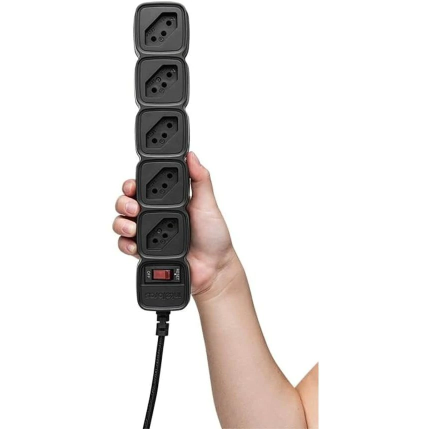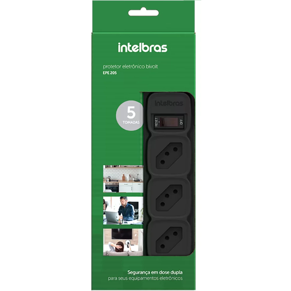 O Protetor Eletrônico EPE 205 além de prover mais tomadas para conectar os equipamentos, também protege esses equipamentos contra surtos de tensão, curto ou sobrecarga. Isso porque ele conta com dupla proteção composta por chave inteligente e varistor. Esse modelo possui como destaques o fato de possuir 5 tomadas para conectar equipamentos e ainda conta com chave liga/desliga inteligente, que elimina a necessidade de se utilizar fusível. Segurança em dose dupla para seus equipamentos Tenha dupla proteção com chave inteligente contra curco-circuito e sobrecarga e varistor contra surtos de tensão. Distância maior entre as tomadas Com design exclusivo, o EPE 205 possui 5 tomadas e facilita a conexão de diversos aparelhos com tomadas mais distantes uma das outras. Cabo de 1 metro a Intelbras com um cabo robusto, que proporciona durabilidade para o produto e maior distância para conectar seus equipamentos Bivolt automático Praticidade e segurança para seus equipamentos em qualquer lugar com bivolt automático 100 a 240 Vac 50/60 Hz. Especificações técnicas Tensão Nominal: 100 ~ 240Vac(Bivolt Automático) Corrente Máxima: 10A Potencia Máxima de Operação: 1270W(127V) e 2.200 (220 V) Freqüência de rede elétrica: 50 ou 60Hz Conexão de Entrada: Plugue 2P T (NBR 14136) 10A Quantidade de tomadas: 5 tomadas 2P t (NBR 14136) 10A Comprimento cabo de força: 1m Chave liga/desliga: Chave inteligente com indicador luminoso de funcionamento Tecnologias de Proteção: Varistor contra surtos de tensão;