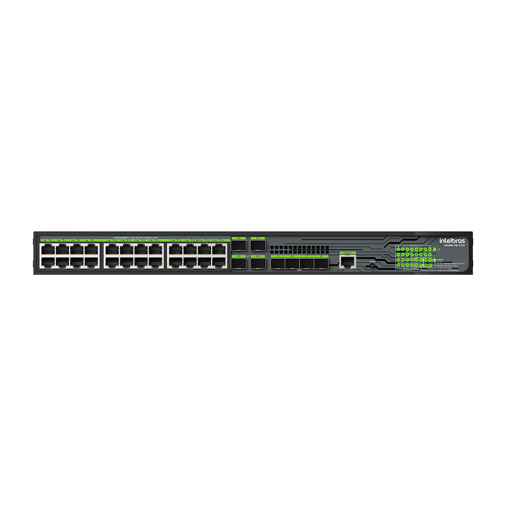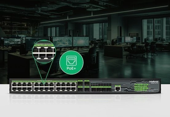 O switch gerenciável S3328G-PB da Intelbras é um equipamento de alta capacidade e desempenho para redes corporativas, oferecendo 24 portas Ethernet 10/100/1000 Mbps com suporte PoE e 4 portas SFP 10G Base-X para uplinks de alta velocidade.